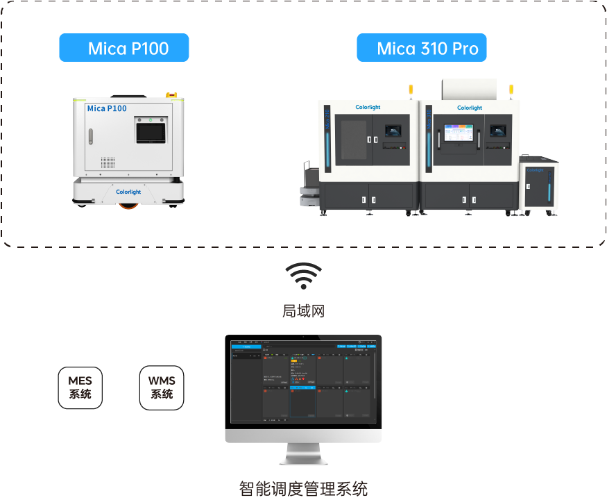 智能调度管理系统可同时对多台Mica P100进行任务分配、路线规划、交通管制、状态监控。1台Mica P100可同时满足6条全自动产线校正系统的供料和下料,实现集群的高效有序协同作业,还能衔接上下游自动化设备,对接MES、WMS等系统,打通全流程自动化。