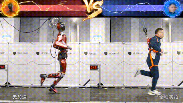 在一场别开生面的“人机赛跑”演示中,机器人Bolt与公司创始人王宏涛在特制跑步机上竞速。戏剧性的一幕发生了:创始人因一个踉跄而中断奔跑,而Bolt却步伐稳健,持续加速,最终将峰值速度定格在了计数器上一个惊人的数字:10米/秒。