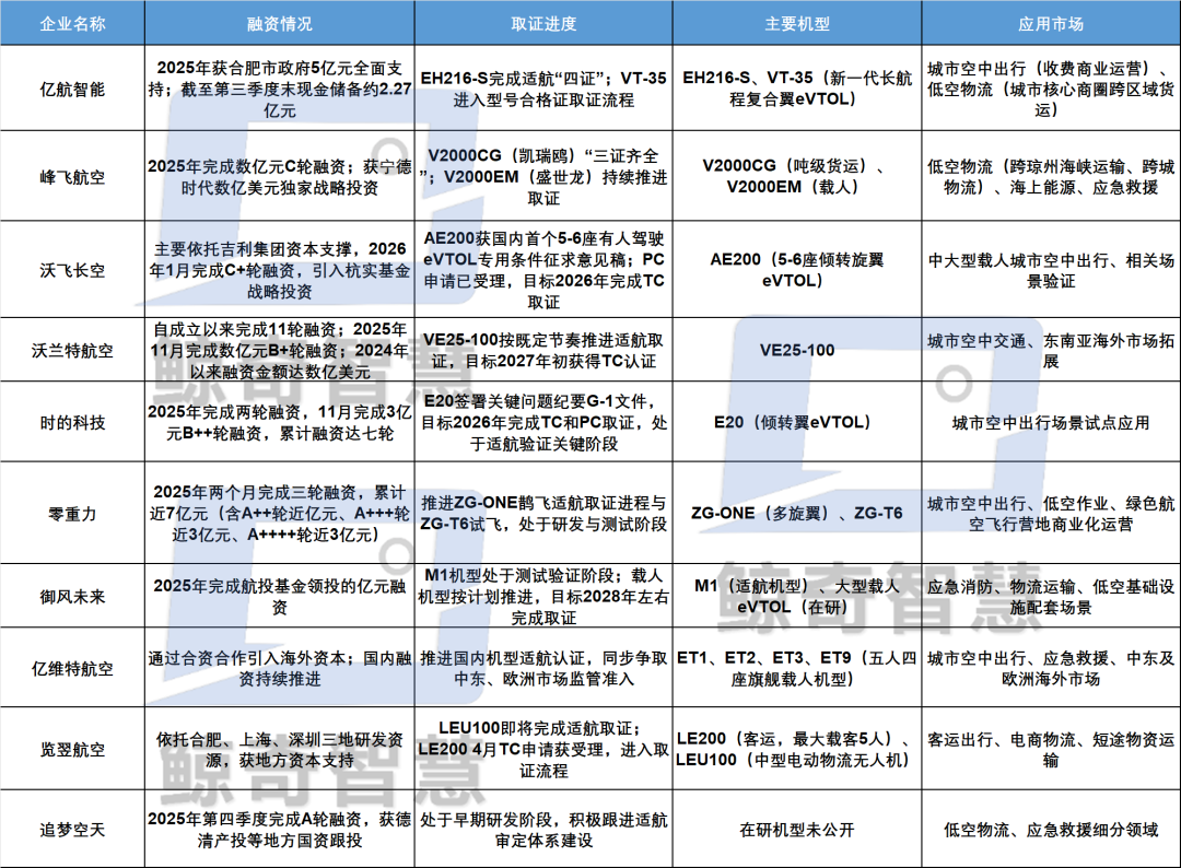 全产业链整合加速,龙头企业凭借资金、供应链与适航进度优势持续领跑,差异化路线成为中小玩家突围关键。