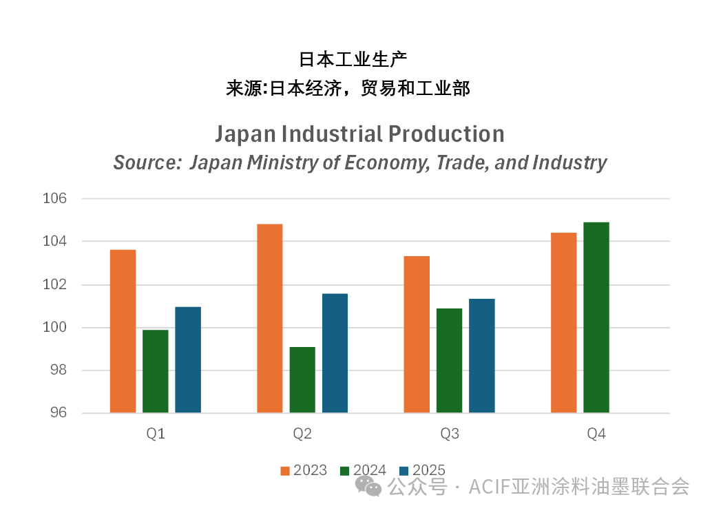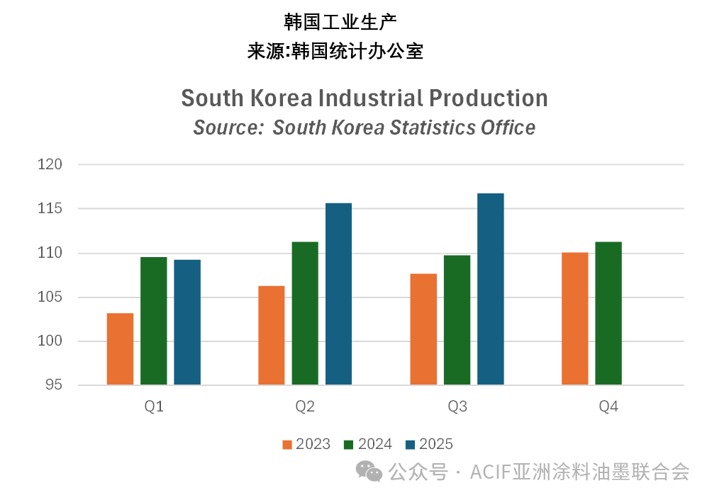 与北方的收缩形成鲜明对比的,是南方的强劲增长。印度市场以产量+5.0%、产值+6.0% 的预测表现一骑绝尘,成为亚洲无可争议的增长极。其增长是全方位的,从装饰漆、汽车原厂漆到各类工业防护涂料,几乎所有品类均预期实现5%-6%的高增长。这得益于印度国内蓬勃的基础设施建设、房地产扩张以及活跃的制造业投资。