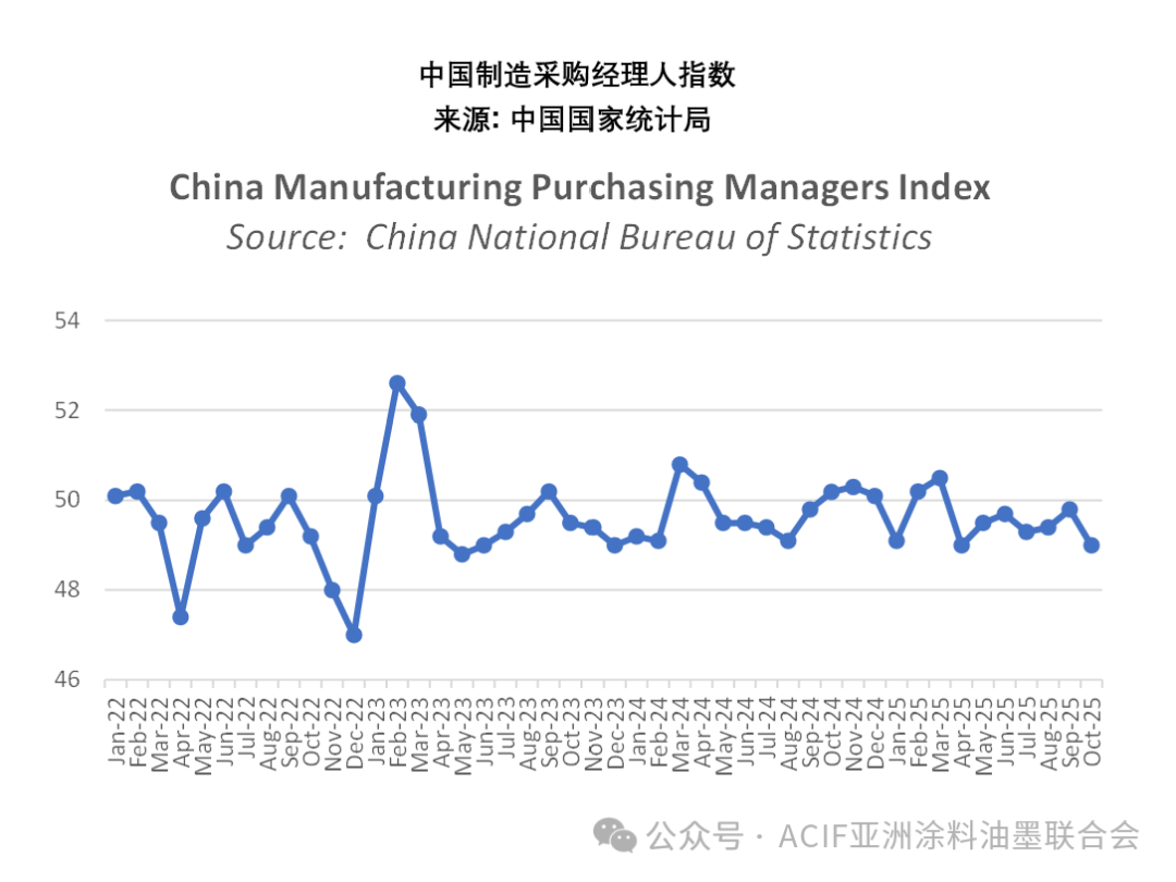 与此同时,反映制造业活跃度的中国制造业采购经理指数(PMI) 在相当长的时间内于50的荣枯线下方弱势震荡(如下图所示,2024年1月至2025年10月的数据多在48.0至49.2之间)。这印证了制造业活动的普遍疲软,使得除汽车等少数领域外,绝大多数工业涂料细分市场(如通用工业、卷材、包装涂料等)增长停滞,缺乏上行动力。