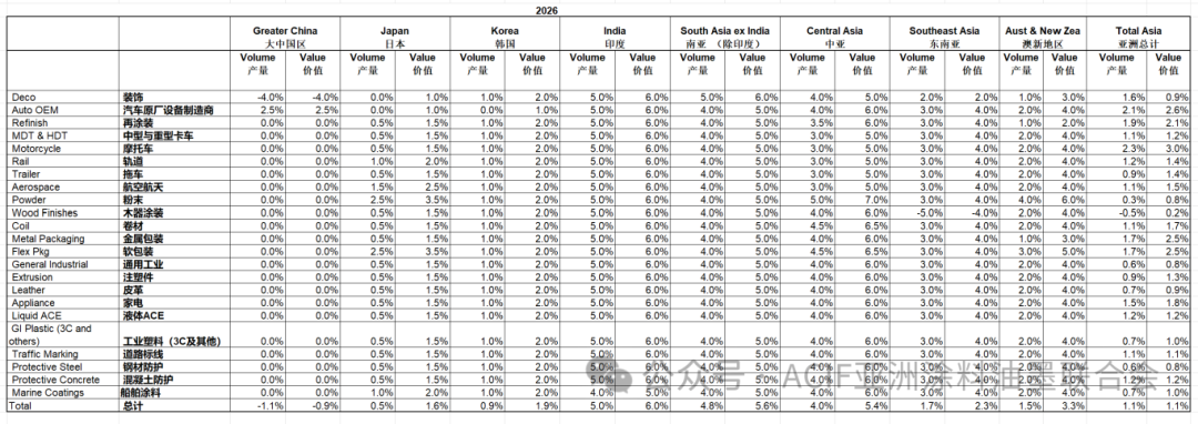 2026年的亚洲涂料市场将呈现一幅增长乏力但内部分化剧烈的图景。整体市场预计仅实现1.1% 的产销量值增长,这一微弱增幅掩盖了不同地域与行业间深刻的命运差异:以中国为核心的大中华区持续收缩,而以印度为首的南亚与东南亚地区则正成为驱动亚洲市场前行的新引擎。