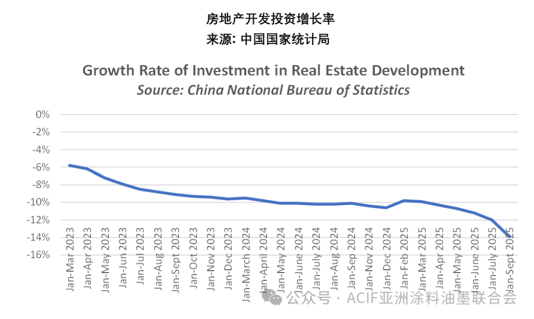 正如下图所示,中国房地产开发投资完成额累计同比增速自2023年初以来持续处于负值区间,且收缩幅度呈持续扩大之势,从2023年1月的-5.8%一路下行至预测中2026年4月的-11.3%。房地产行业的深度调整,直接导致其对建筑装饰涂料的需求大幅萎缩,该细分品类(Deco)预计将下降4.0%。