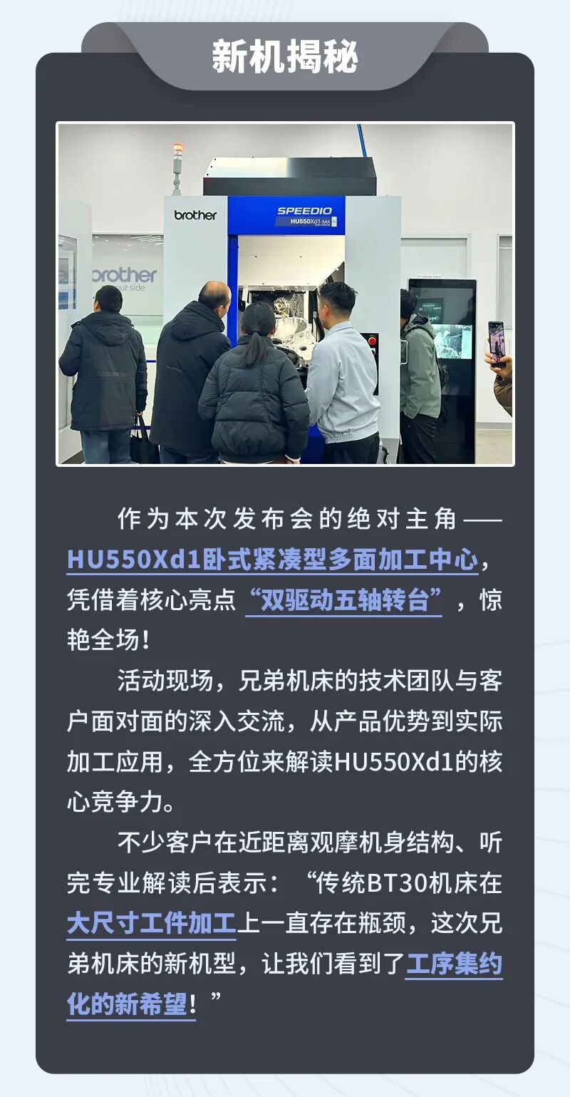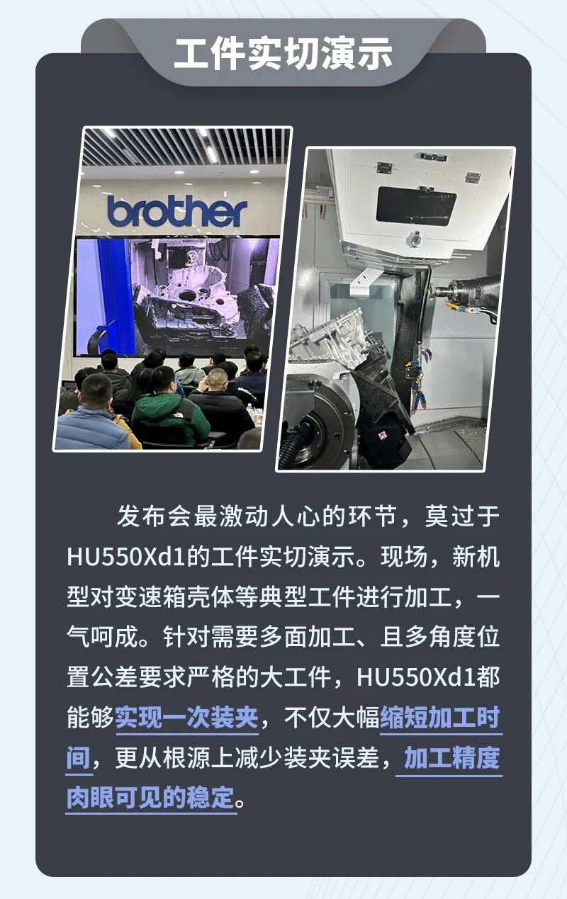 兄弟HU550Xd1紧凑型卧式五轴加工中心集成B/C轴双转台结构,工作台尺寸达550×550mm,最大载重500kg,为Speedio系列中装夹能力最强机型。