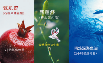 结合植物愈伤组织与超酶自融技术实现高活性成分温和、稳定与高效渗透。甄莲舒(穿心莲叶提取物)靶向抗炎,即时舒缓皮肤泛红痛痒,从源头阻断炎症反应;甄肌瓷(石榴果鞣花酸)通过愈伤组织培养提升鞣花酸水溶性与生物利用度,抑制炎症后色素沉着;精炼深海鱼油实现无色无味透明液体,补充肌肤必需脂质修复屏障。