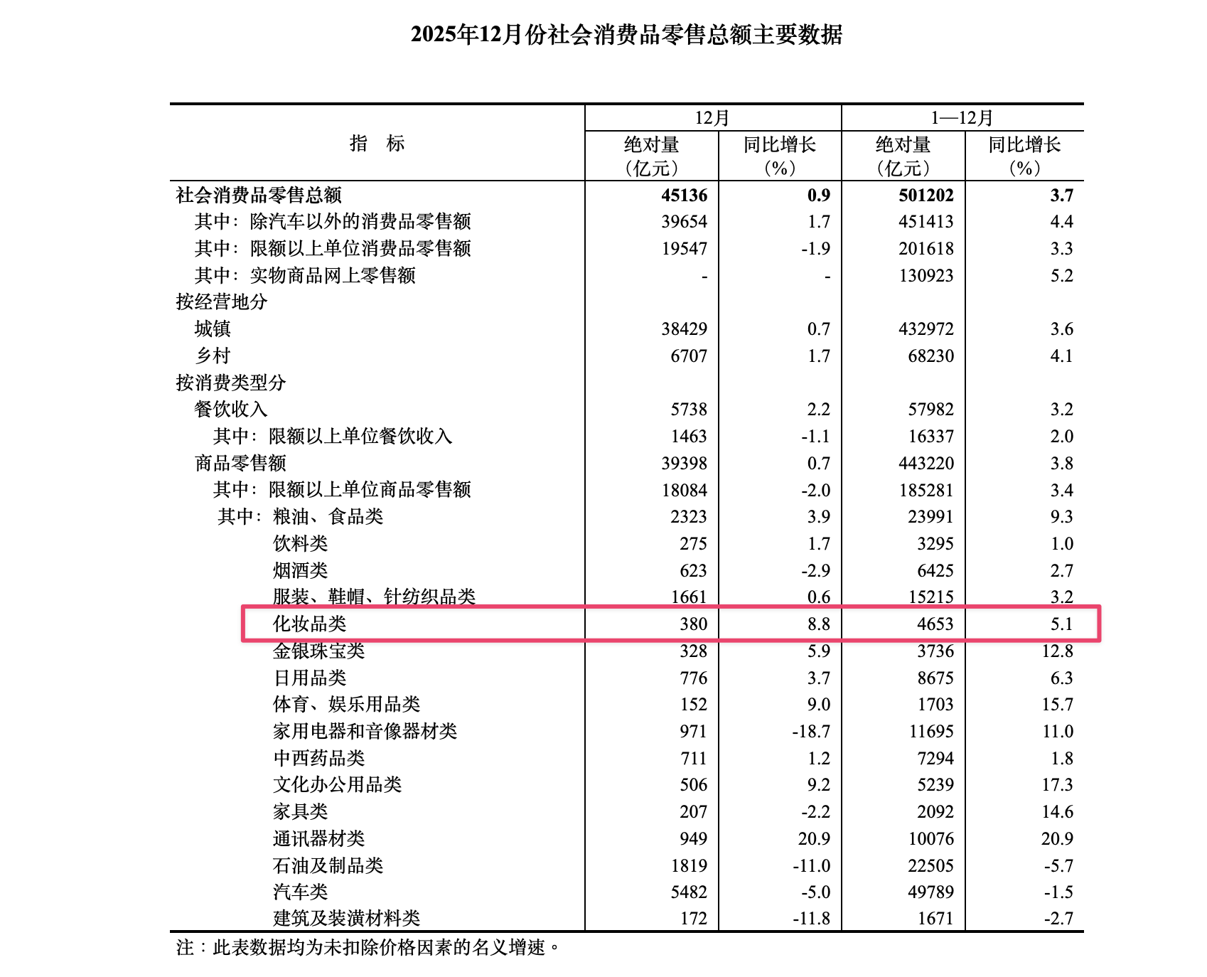 1 月 19 日,国家统计局发布 2025 年 12 月份社会消费品零售数据。数据显示,2025 年全年化妆品类零售额达 4653 亿元,同比增长 5.1%,较同期社会消费品零售总额 3.7% 的整体增速高出 1.4 个百分点。