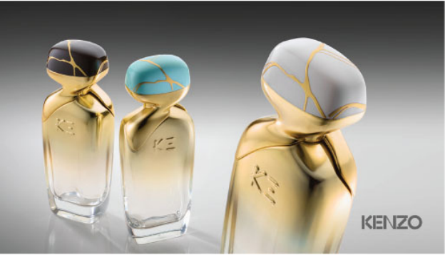 Apogee 为 Kenzo K3 香水开发的包装是对设计师高田贤三生平的致敬。玻璃瓶是高大细长的矩形,边缘柔和,轮廓清洁优雅。瓶子装饰的金色渐变通过金属化实现。瓶盖和瓶身的形状和颜色融合在一起,增强优雅感。瓶盖进一步通过源自自然的颜色增强。其最独特和创新的特点通过手工应用的水转印标签实现,创造出类似金缮 (kintsugi) 的图案,向日本用金缝修复破碎陶器的艺术致敬,这个设计颂扬不完美之美和永恒的转化艺术。