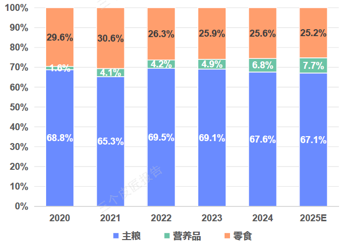 1、主粮功能化:重新定义“主食”边界消费升级的焦点已从“让宠物开心”转向“让宠物健康”。主粮品类通过无谷、天然、处方粮、特定功能(美毛、护关节)等高端化创新,大幅提升了产品价值与客单价。当每日必需的主粮本身就能提供精准健康保障时,其消费基本盘愈发稳固,模糊并挤压了零食的传统空间。