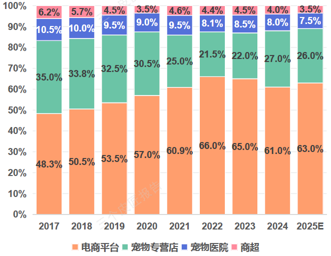 电商渠道以超六成的占比绝对主导,但宠物专营店在经历挤压后正凭借专业化服务实现结构性反弹,渠道竞争进入新阶段。