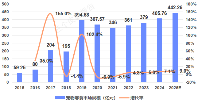 中国宠物零食市场已步入百亿级规模,呈现高速增长后趋稳的成熟态势。根据历史数据,行业规模从2015年的低位快速攀升,尤其在2019年录得102.4%的同比高增长,成为行业发展的关键节点。此后增速放缓,至2024年市场规模达405.76亿元,表明市场已由爆发期转入稳定扩容阶段,增长势头依然坚实。