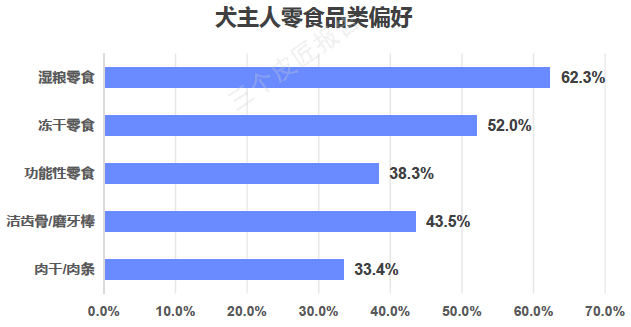 犬猫零食存在显著差异,猫零食市场偏好选择悬殊,湿粮(80.1%)作为核心品类,与猫咪泌尿系统健康需求紧密绑定;犬零食则分布相对多元,除湿粮(62.3%)外,冻干与肉干/肉类制品占据重要份额,反映了犬只在训练、磨牙等行为互动上的多样化场景。