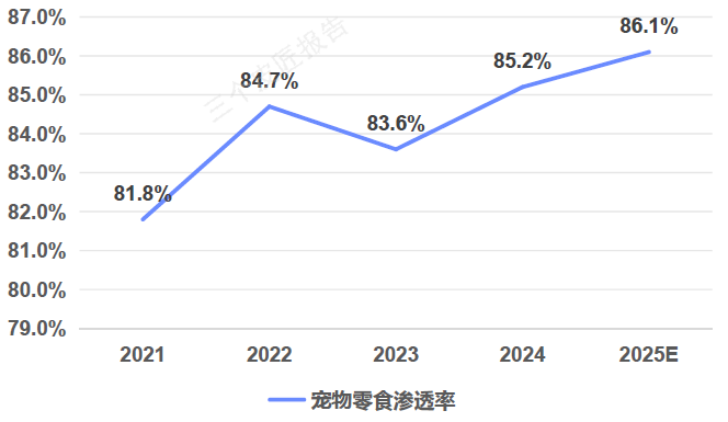中国宠物零食市场渗透率稳步提升,从2021年约81.8%增长至2023年83.6%,2025年将达86.1%,反映品类已从可选消费延伸为养宠常态需求,行业成熟度持续深化。