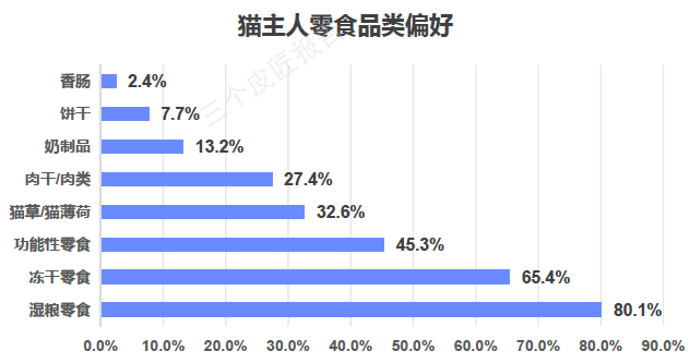从品类偏好分析可见,“健康养宠” 已从概念转化为具体消费行为,驱动零食品类向功能化、高端化演进。猫犬主人均高度青睐湿粮、冻干等高附加值品类,其背后是消费者对“天然食材”、“高肉含量”及“锁鲜工艺”的追求。