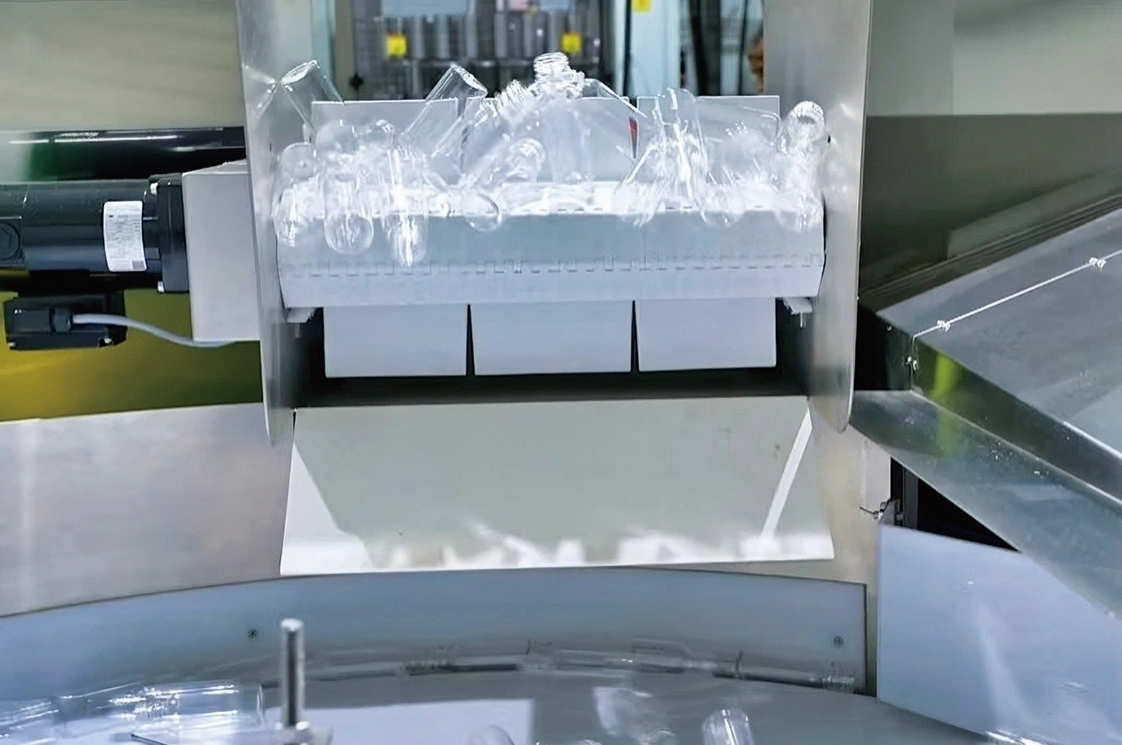 多功能理瓶机正将PET容器送入生产线。