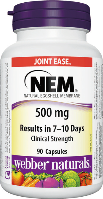 加拿大知名品牌Webber Naturals推出了以NEM为核心成分的关节护理产品,并采取与低剂量氨糖进行复配的策略,以覆盖更广泛的消费群体认知。其产品“NEM Natural Eggshell Membrane”在包装显著位置标注“7-10天内缓解关节疼痛”,这一强有力宣称直接击中消费者渴望快速止痛的心理需求,使其在同质化严重市场中脱颖而出。