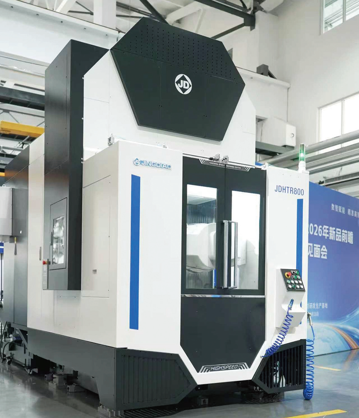 JDHTR800 卧式五轴加工中心作为本次新品前瞻的核心亮点,以高效率加工为核心优势,同时兼顾精度稳定性,其运动速度、切削能力、排屑效率及换刀速度均表现突出,特别适用于新能源汽车电机壳体等具有深腔结构的汽车零部件批量加工。该设备通过优化结构设计与热稳定性管控,对关键部位实施精准温度管控,还可根据需求选配更高精度配置,进一步提升加工品质。