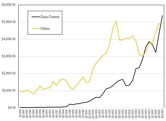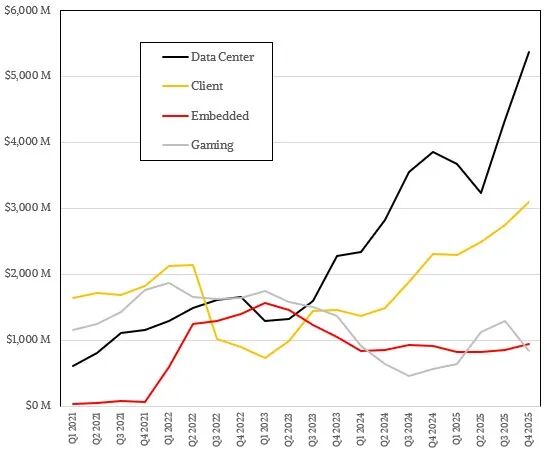 有意思的是计算AMD其余业务的收入。2025年,AMD非数据中心部分(约占总收入一半)的销售额略高于180亿美元,增长了36.3%。AMD其余业务的年增速甚至快于数据中心业务。这就是为什么必须按年度观察英伟达、AMD、英特尔和博通,这也解释了芯片制造商与其超大规模云厂商客户之间产品周期的巨大波动。产品周期驱动投资周期,当然还会伴随供应链的静态波动。