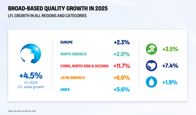 在财报中,达能首席执行官盛睿安称,在2025年,该公司再次实现了广泛且高质量的增长,以健康为核心的产品组合的实力与韧性,又一次得到体现。期内,同比销售收入增长4.5%,这得益于积极的销量与组合表现,并得到多引擎增长模式的支持。