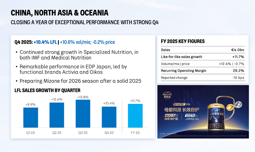 小食代留意到,在中国、北亚及大洋洲地区(CNAO),2025年全年,饮用水和饮料业务的销售收入增长6.1%至7.77亿欧元,其中在第四季度,该业务销售收入为8100万欧元,和去年大致持平(增长0.1%);该地区专业特殊营养业务2025年收入为27.68亿欧元,同比增长13.2%;其中在第四季度为7.21亿欧元,增长10.4%。
