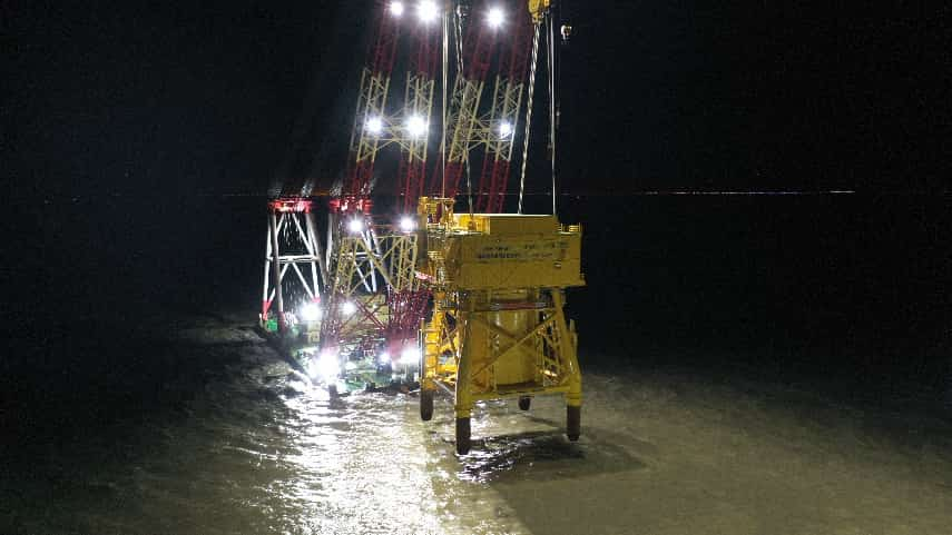 在最关键的海上吊装环节,面对数据舱入水的巨大浮力变化以及导管架支腿插尖需插入海底钢管桩、两者间隙仅0.18米、偏差必须控制在10厘米以内的极高精度要求,项目团队依托“三航风范号”起重船的卓越性能,在GPS与专业定位软件的引导下,由技术负责人现场统一调度指挥,将下放速度严格控制在每分钟0.1米。