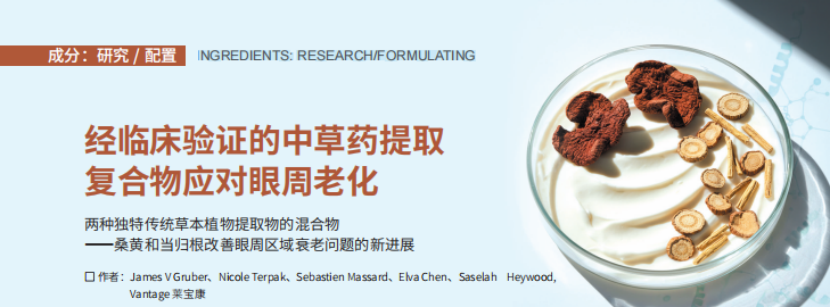 「成分:研究 / 配置」栏目中,收录了桑黄和当归根提取物在眼周抗衰领域的临床验证,展现了中草药现代化应用的巨大潜力。