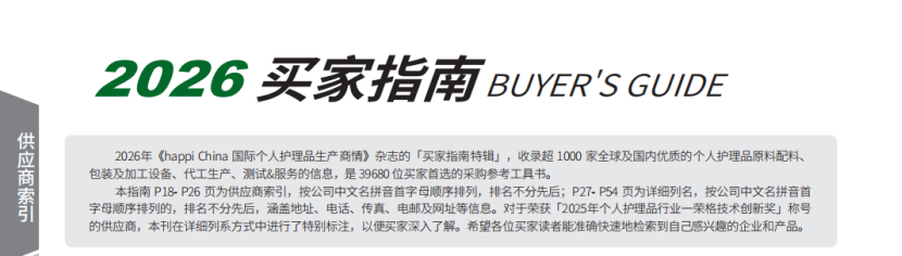 本期 《happi China》重磅推出「2026买家指南」,我们梳理了原料配料、包装与设备、OEM & ODM、测试与服务的优质供应商,配套索引与完整联络方式,便于研发、采购与质量团队建立全年候的选型清单与备选池。